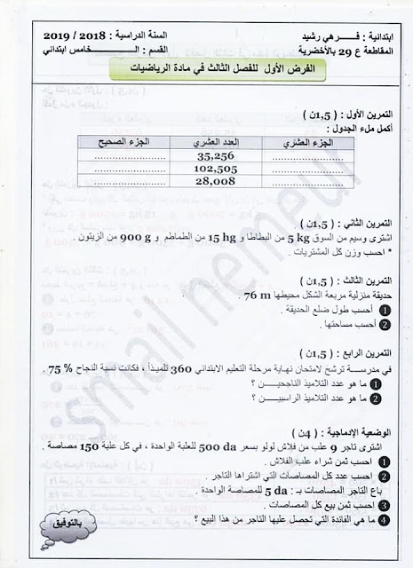 الامتحان التجريبي الثاني في الرياضيات 5 ابتدائي فرهي رشيد