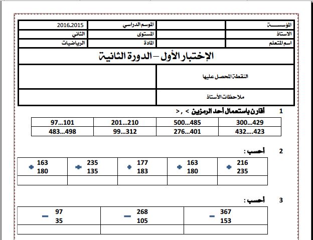 الفرض الكتابي الثاني 2 في مادة الرياضيات السنة الثانية ابتدائي