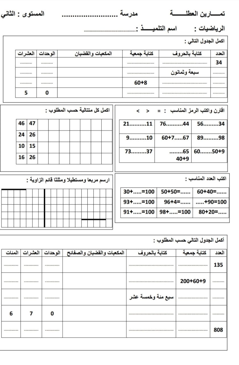 تمارين داعمة للمستوى الثاني ابتدائي في مادة الرياضيات الموسوعة